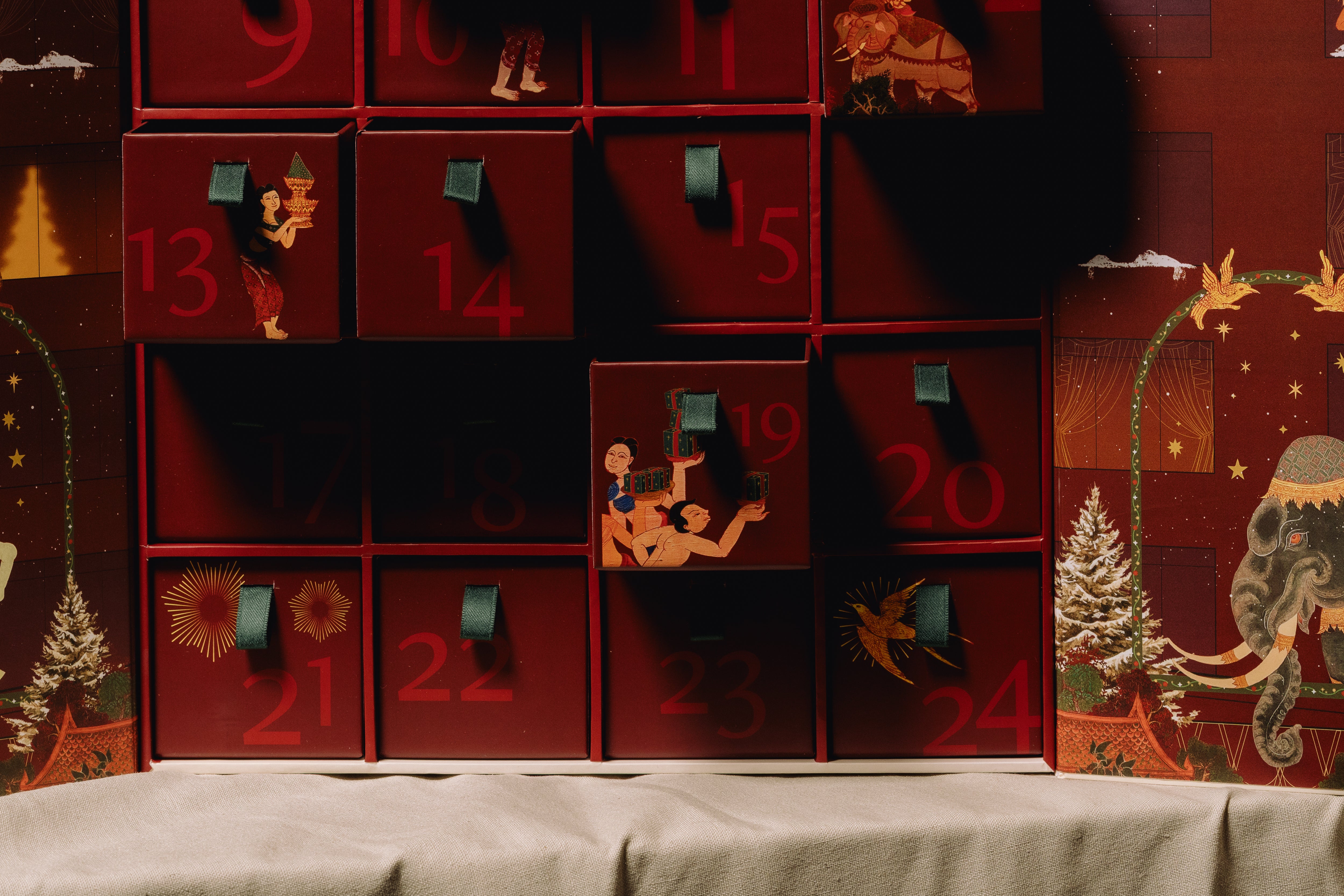 Mocha & Muffins’ exclusive 2025 Advent Calendar was inspired by Anantara Siam’s grand staircase mural, and features celestial angels, mythical creatures, and courtly figures from Thai tradition. Behind each door, discover a daily indulgence — handcrafted chocolates that capture the magic of Christmas, transforming every December day into a moment of wonder.